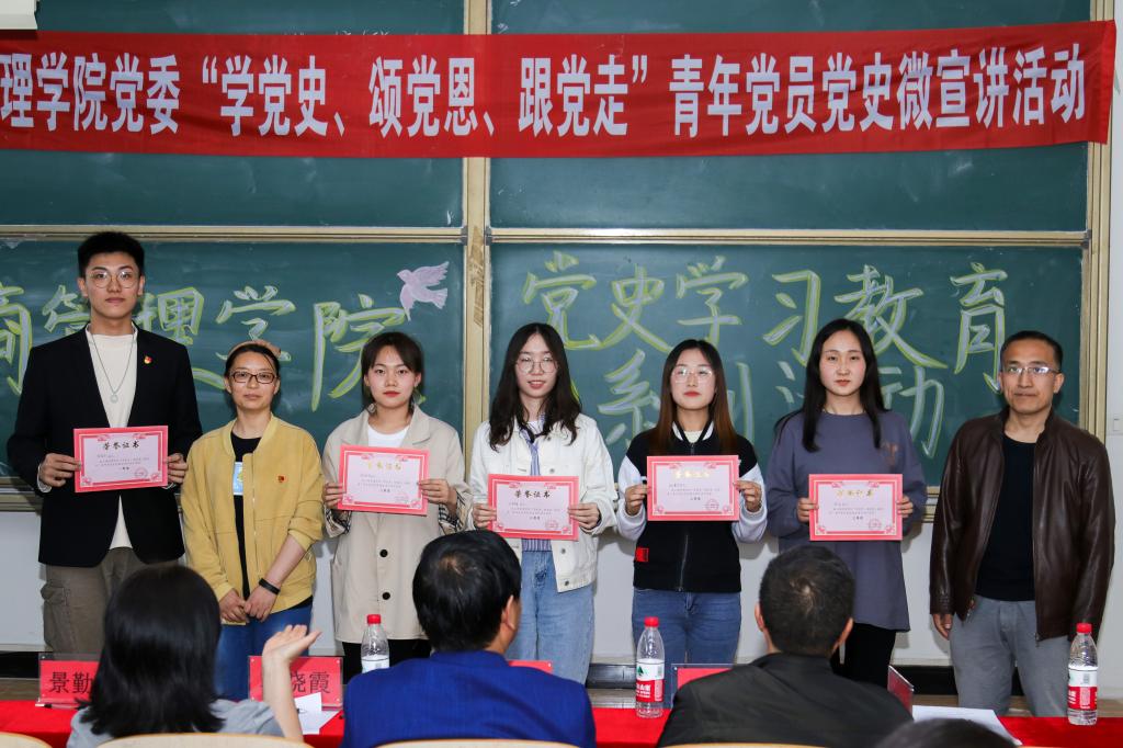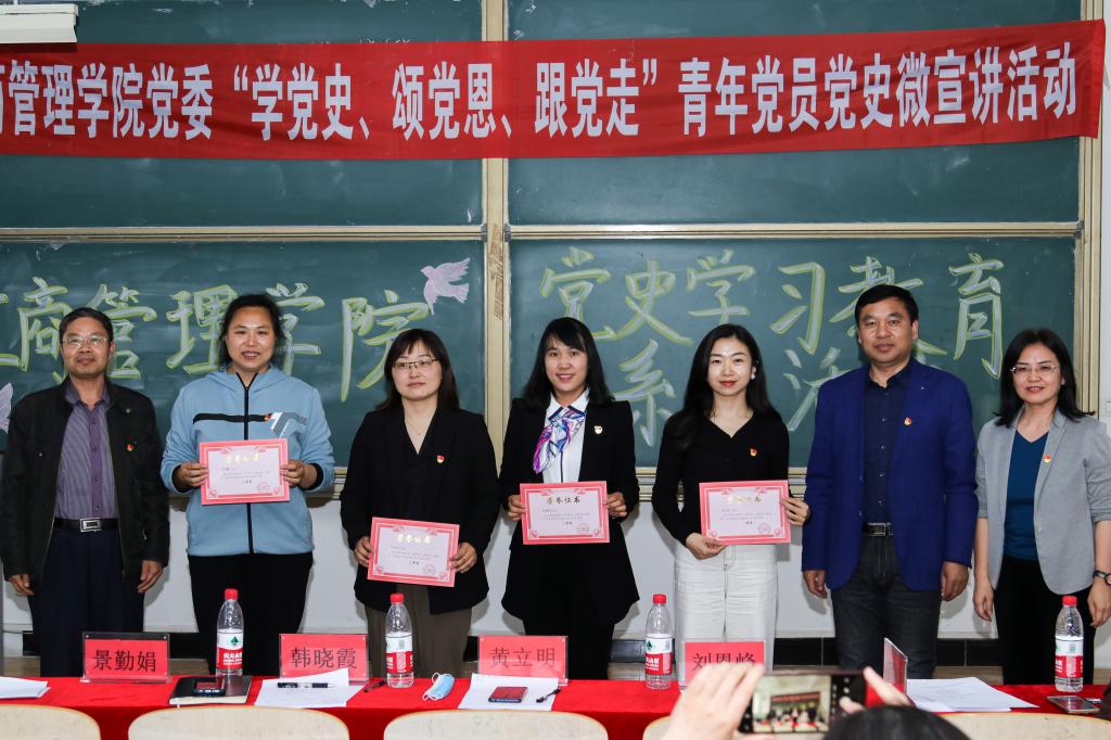 为引导党员师生从百年党史中感悟思想伟力,汲取奋斗力量,5月13日下午,365best体育亚洲官网党委举办“学党史、颂党恩、跟党走”青年党员党史微宣讲活动。青年党员教师和学生党员代表共计28人参加了比赛,学院院长黄立明、副书记副院长韩晓霞、原学院党委书记刘恩峰、教工党支部委员景勤娟、柴朝华作为评委出席,学院全体党员师生观看了比赛。