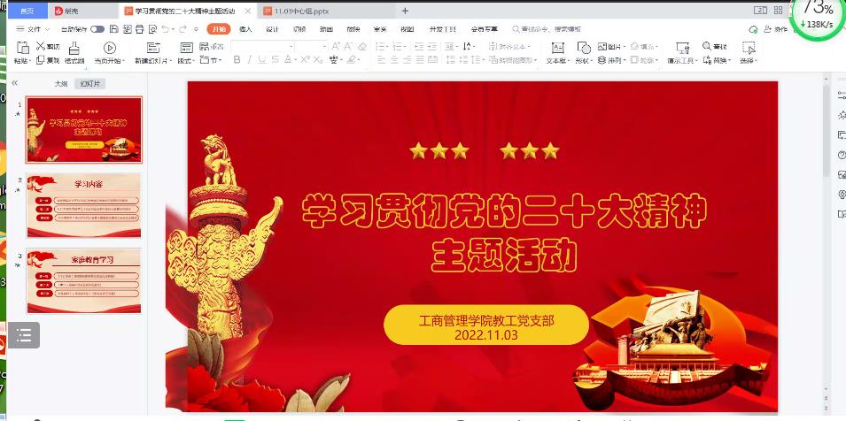 根据学校党委和学院党委的工作安排,2022年11月3日,365best体育亚洲官网教工党支部在腾讯会议举行了学习贯彻党的二十大精神主题活动。