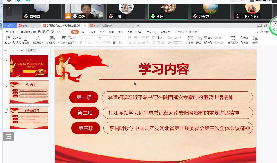 李晖同志和杜江萍同志分别领学习近平总书记在陕西延安和河南安阳考察时的重要讲话精神。习近平总书记深入陕西延安市和河南安阳市的农村、学校、红色教育基地、文物保护单位等进行调研与考察。在考察中总书记特别强调全面建设社会主义现代化国家,最艰巨最繁重的任务仍然在农村。要全面学习贯彻党的二十大精神,坚持农业农村优先发展;通过文物发掘、研究保护工作,才能更好地传承优秀传统文化,增强中国人民的家国情怀。