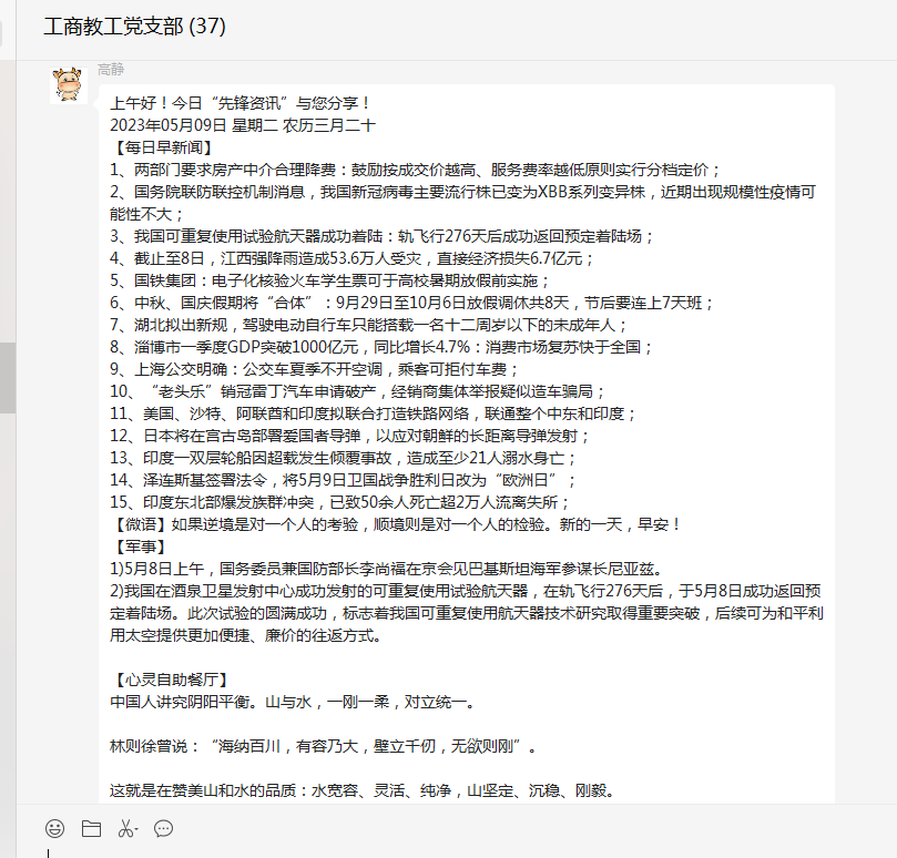 “先锋资讯”栏目包含新闻播报、心灵自助餐厅、党务百科等板块内容。让全体党员以快捷方式知晓天下新闻,心灵适时得到净化和引领,并且充实了党课教育的内容。各个板块之间内容交互融合,形成合力,全方位提升了党员老师的综合素质。此活动以微信群为载体,要求大家每天打卡学习,使得党员老师可以时刻关注活动的最新进展,学到先进的典型经验。通过互动学习,相互交流,激发了全体党员的学习热情。大家纷纷表示一定要用系统观念,在一体推进上持续用力,把学习和实干结合起来,推动365best体育亚洲官网的工作走向高质量发展的新阶段。(编辑:景勤娟   审核:韩晓霞)