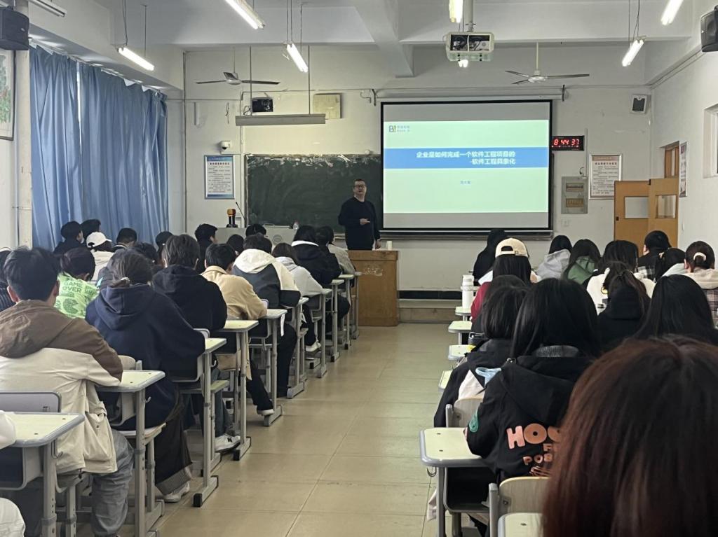 在讲座过程中,贾总经理通过诙谐生动的语言、图文并茂的幻灯片、丰富翔实的案例給大家呈现了软件工程项目的论证规划、分析设计、开发实施及售后运维等全生命周期的各个环节中细节及要点,学生们反响热烈,纷纷反映获益良多。