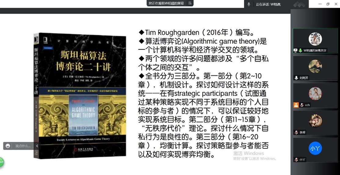 2022年11月17日下午,刘海滨副院长主持腾讯会议,数字孪生与智慧管理科研团队开展了第三次讨论活动。会上,王湘玉老师分享了“算法博弈论”领域内的一些焦点问题和重要理论。主要围绕单参数环境下的机制设计问题,基于理想化拍卖、迈尔森引理的内容和应用、算法机制设计以及收益最大化拍卖的理论进行了学习汇报。与会老师们结合各自的研究方向,对如何应用机制设计理论进行了深入探讨。刘海滨副院长对团队的学习和讨论给予了充分肯定,指出纳什均衡、机制设计等理论在计算机科学研究中的重要性,并鼓励团队成员奋发进取,互相学习交流,再此强调务必让团队成为踏踏实实做科研的科研团队。(撰稿人:王湘玉,审核人:刘海滨)