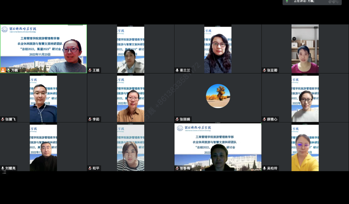 2022年11月23日,农业休闲旅游与智慧文旅科研团队召开“总结2022,展望2023”在线会议,会议由旅游管理专业带头人方巍博士主持,旅游管理教学部张骥飞主任,王颖教授、张春梅教授、李茹副教授、张丽娟副教授、易兰兰副教授、吴柏玲副教授、张亚卿副教授、薛亚娟老师、刘耀亮博士、王和平老师参加。