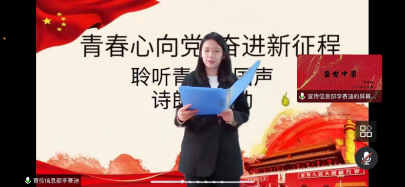 经过初期的视频筛选,共有13位优秀选手进入到线上决赛环节,决赛中,21级市场营销余婵娟同学动情朗诵《我骄傲,我是中国人》,让我们感受到生于华夏,何其幸福,身为中国人又何其骄傲;21级人力资源管理专业孙毓婉同学朗诵的《青春中国》让我们看到了青年中国的新风貌,时代发展的新脉搏;22级物流管理程思雨同学朗诵的《祖国啊,我亲爱的祖国》,让我们听到了新时代青年对祖国的歌颂与难以诉说的热爱;22级物流管理专业李梓彤同学朗诵《百年大党,辉煌中华》,铿锵有力的声音诉说着党的领导下的盛世中国,诉说着中国青年的责任与担当。最后余婵娟、秦雨颂,孙毓婉获得前三名。