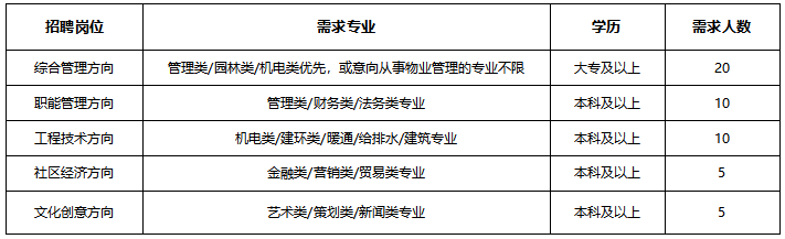我们寻找的目标人群2020届毕业生,专业不限,愿意投身物业服务行业。拥有强烈的学习意愿,愿意保持持续的学习状态。拥有强烈的目标导向,行动迅速,执行力强。能够承受压力,有百折不挠的奋进精神。