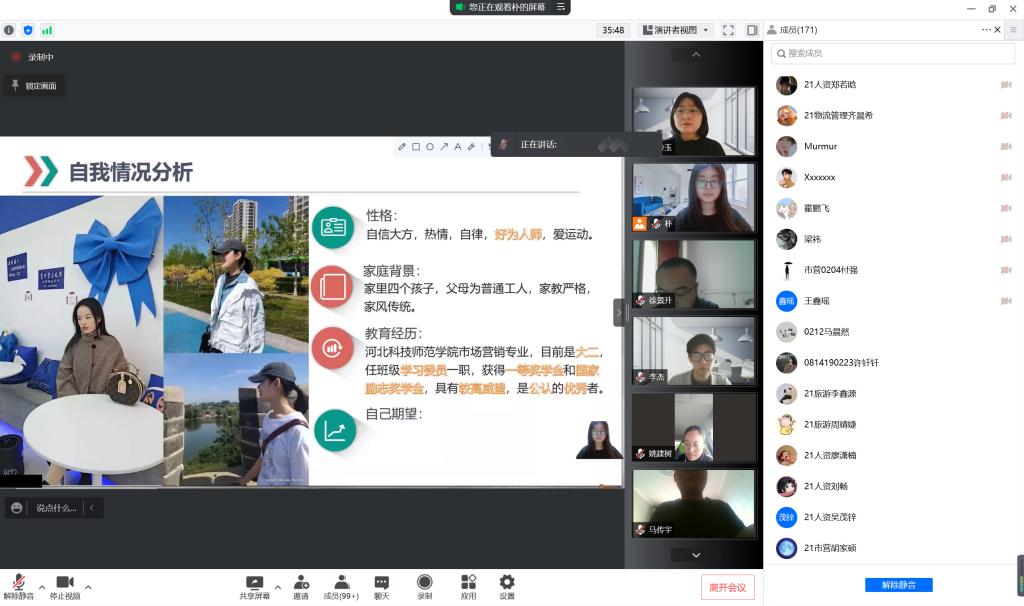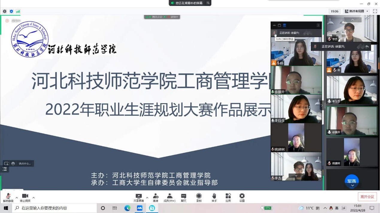 为促进学生提前进行职业规划,进一步提升就业紧迫性和职业竞争力,2022年4月28日,365best体育亚洲官网通过“腾讯会议”平台,举办了“规划未来 奋斗青春”职业生涯规划大赛。比赛特邀365best体育亚洲官网副书记、学工办主任,以及承担《大学生职业生涯规划》课程授课老师担当评委,来自365best体育亚洲官网5个专业的19名选手参加了此次大赛,180余名学生代表观看了职业生涯大赛的优秀作品展播。