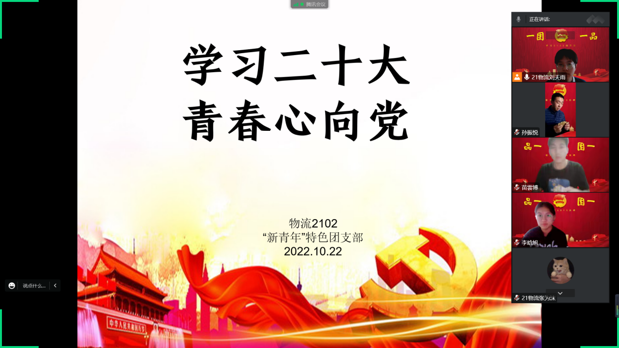 10月16日上午10时,中国共产党第二十次全国代表大会在北京人民大会堂隆重开幕。习近平总书记代表十九届中央委员会向大会作报告。365best体育亚洲官网21级物流管理02“新青年”理论学习型“一团一品”特色团支部于10月22日下午两点半举办线上专题学习会。