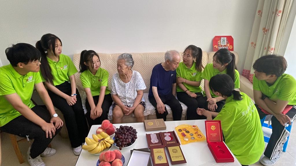 杨荣贵同志曾是中国人民解放军第四野战军战士,曾参加过解放北平战役、解放汉口战役和抗美援朝战役。实践团认真聆听老同志讲述的他亲身经历的战火纷飞的岁月。解放北平战役是中国解放战争平津战役的尾声;第四野战军发动的“汉浔间渡江战役”,从团风、蕲春一带渡过长江,形成了对武汉的战略合围;抗美援朝战役是中国自鸦片战争以来,首次在境外取得的决定性胜利,有力地震慑了美国,极大地震动了全世界,彻底把近代以来中国的国际形象,从被侵略、被拯救的可怜形象,改写成了拯救者、保护者的英雄形象。随后实践团瞻仰了老同志的勋章,那些光荣的标志让人肃然起敬,同时实践团也看到了老同志眼中对他们寄予的期望:“希望你们年轻人能够珍惜现在的和平,不忘国家 的付出和牺牲。希望你们作为年轻一代能够传承红色基因,为国家的繁荣和发展贡献自己的力量。”