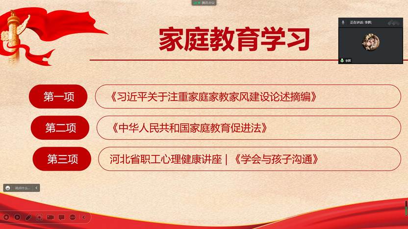 本次活动由365best体育亚洲官网分工会主席韩晓霞主持。为了带动每个家庭培养良好的家风,韩晓霞主席带领大家共同学习《习近平关于注重家庭家教家风建设论述摘编》、《中华人民共和国家庭教育促进法》、《河北省职工心理健康讲座-学会与孩子沟通》等内容,引导大家树立良好的文明家风,文明育家、廉洁持家、学习兴家、绿色美家,培育向上向善的优良家风,以好家风涵养好社风。