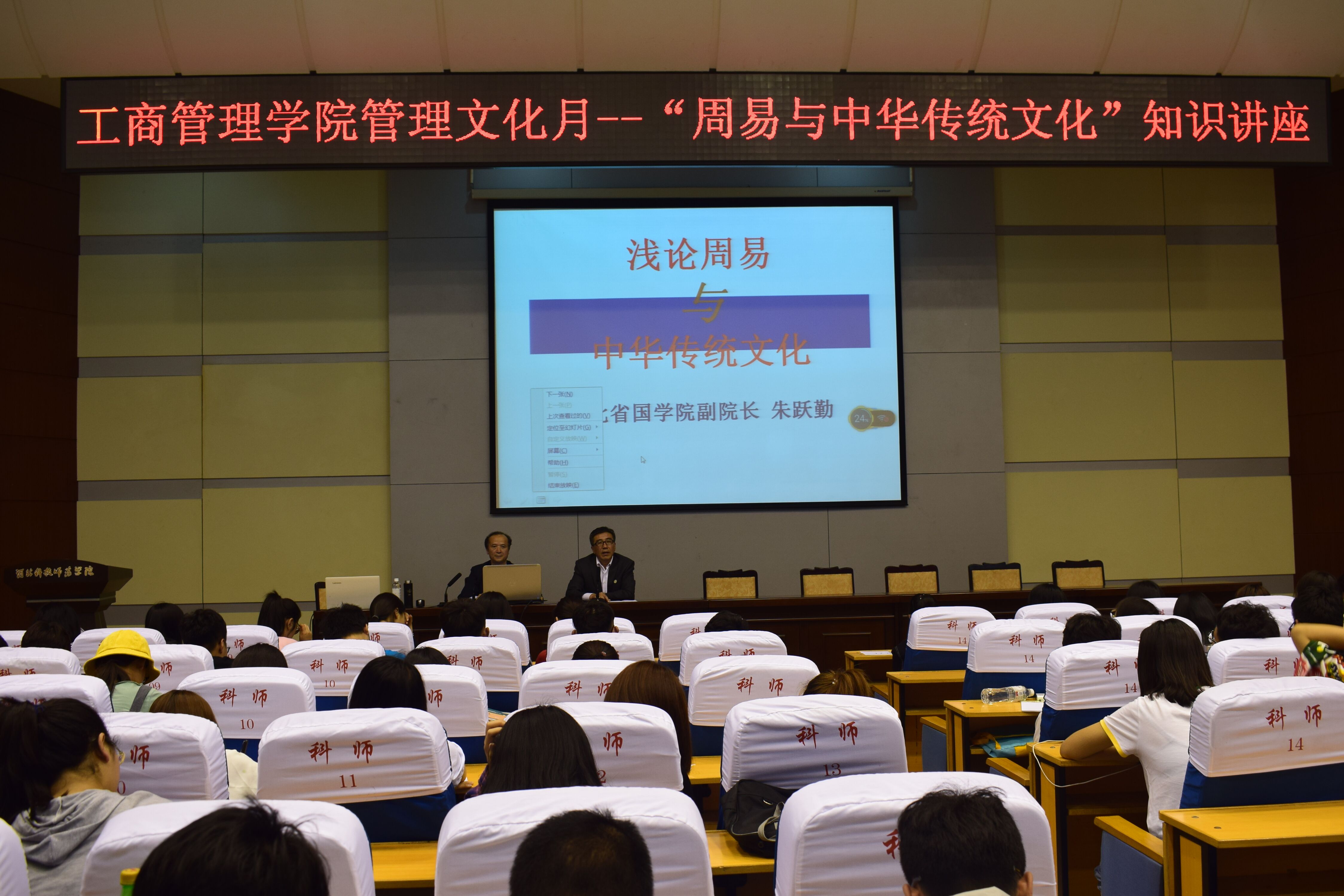 2018年5月14日,365best体育亚洲官网在学术报告厅举办管理文化月之“周易与中华传统文化”知识讲座。秦皇岛市总工会副主席、河北省国学院副院长、秦皇岛市11届政协常委朱跃勤为365best学生讲授了中华传统文化知识,365best院长主持讲座。500余名师生现场聆听了讲座。